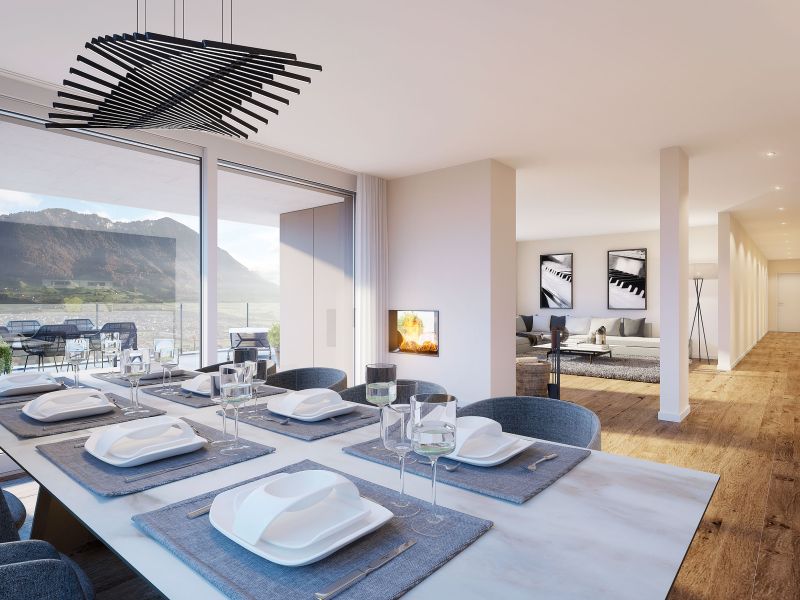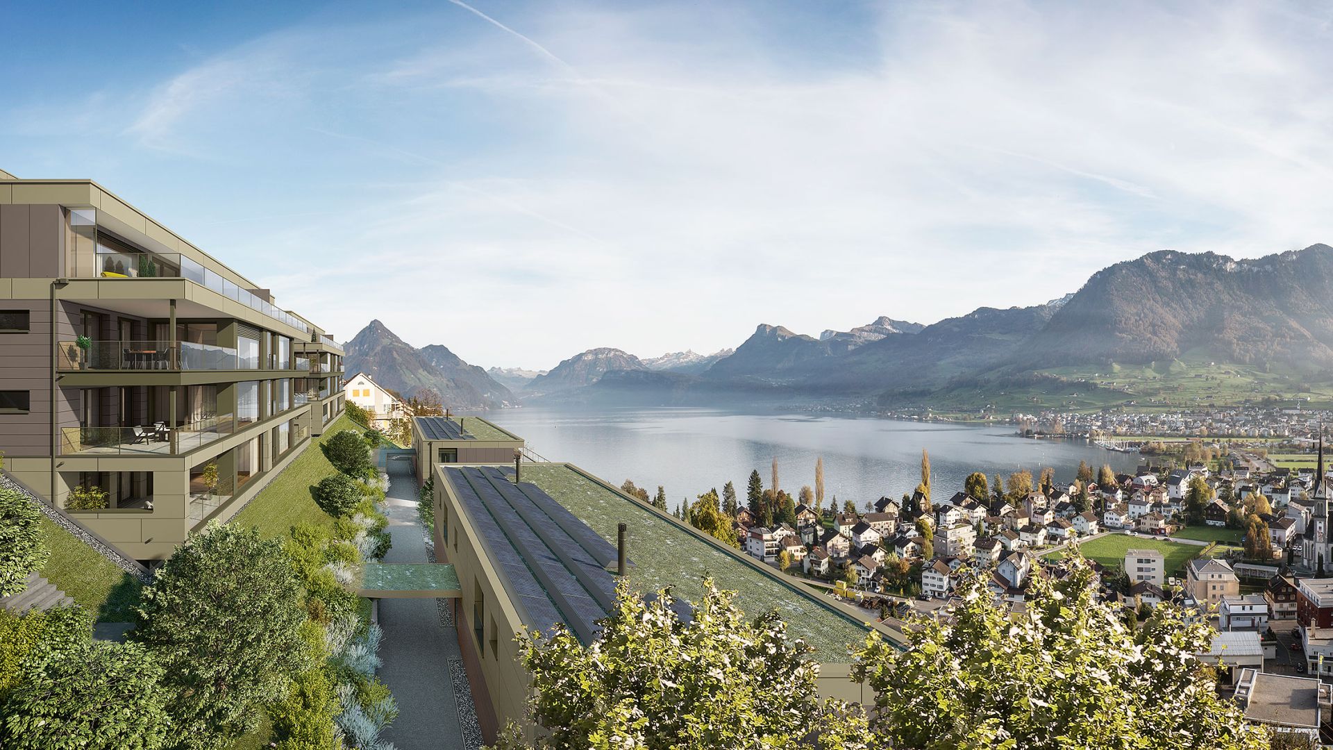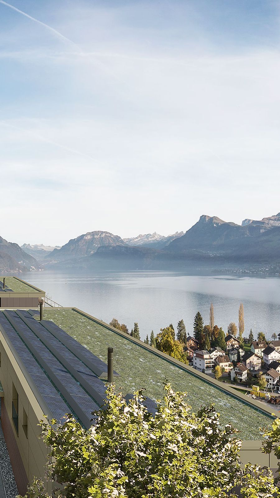 Zur Aussicht und zur Besonnung hin ausgerichtet, bilden die Balkone sowie die grosszügigen Panoramafenster eine abwechslungsreiche Fassadenoberfläche. Grosszügige, zusammenhängende Grünflächen bilden willkommene und angenehme Freiräume und Begegnungszonen für die Bewohner. Talseitig erscheinen die Häuser offen und transparent.