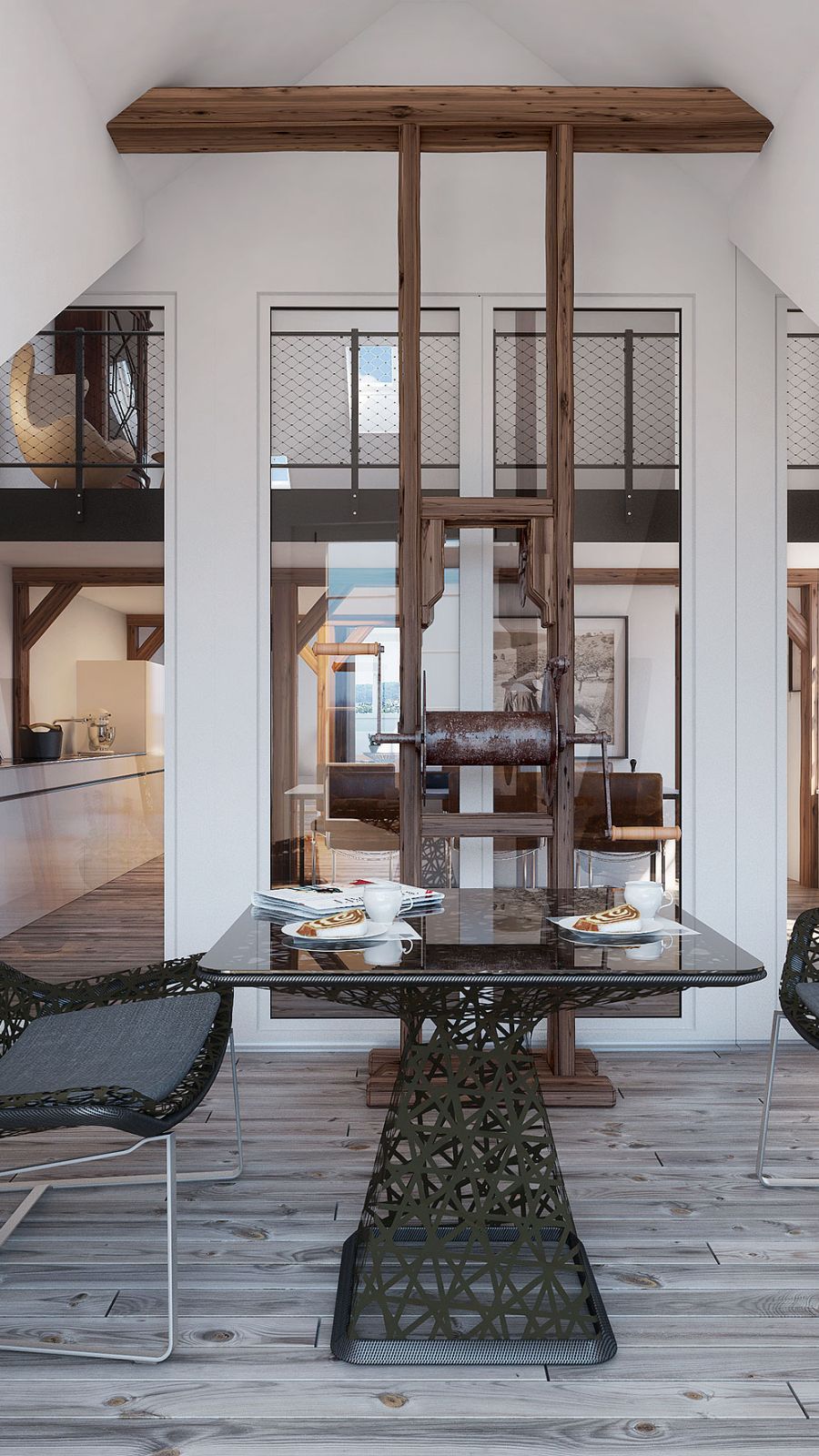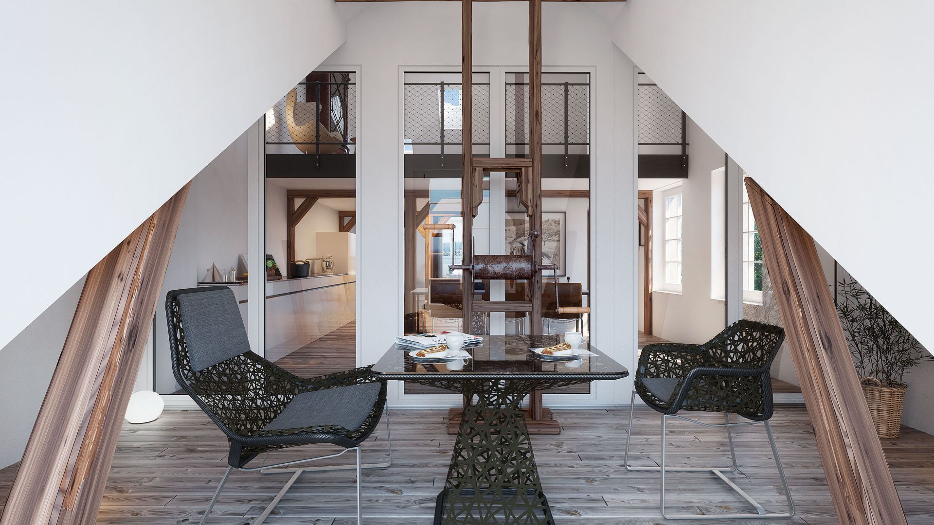 Für die Sanierung einer Bestandsliegenschaft durfte Swiss Interactive die Visualisierungen umsetzen. Wichtig war der Erhalt der historischen Bauelemente. Der Dachgarten mit den alten Bohlenbrettern setzt tolle Akzente und bildet ein harmonisches Ganzes.