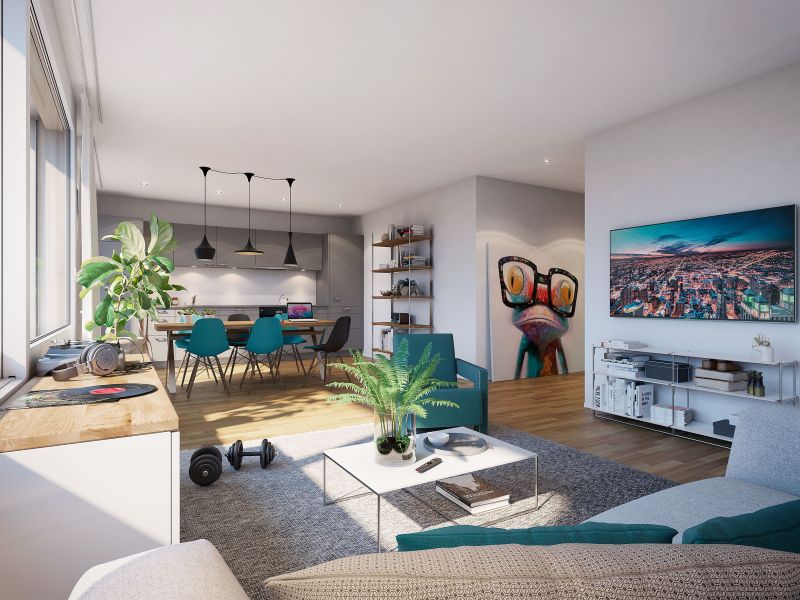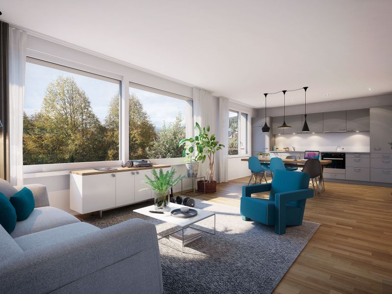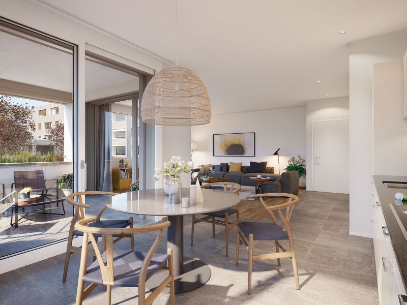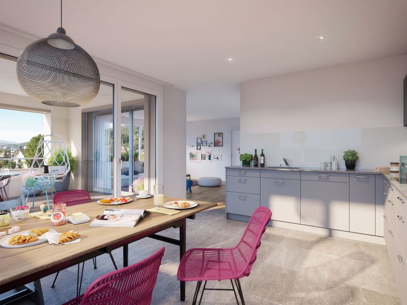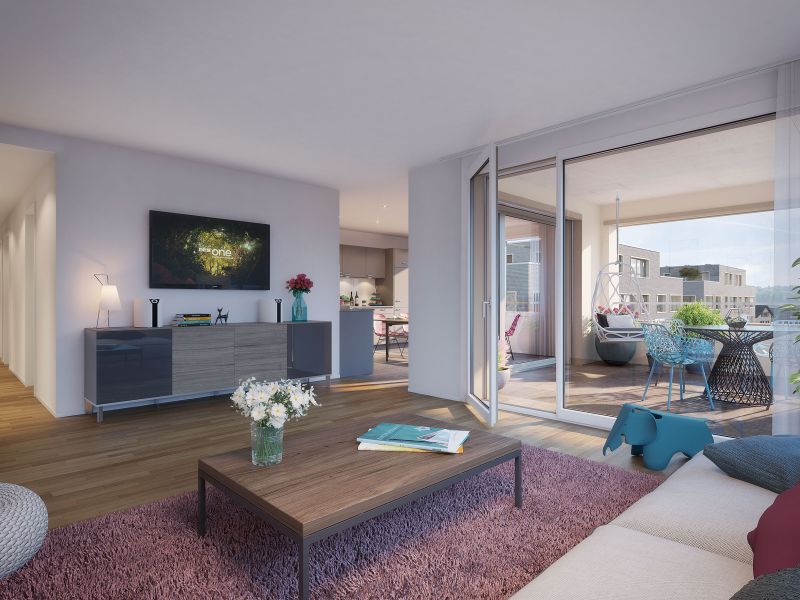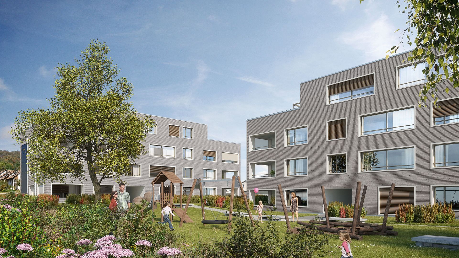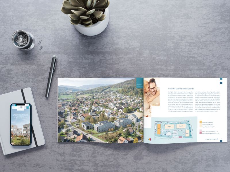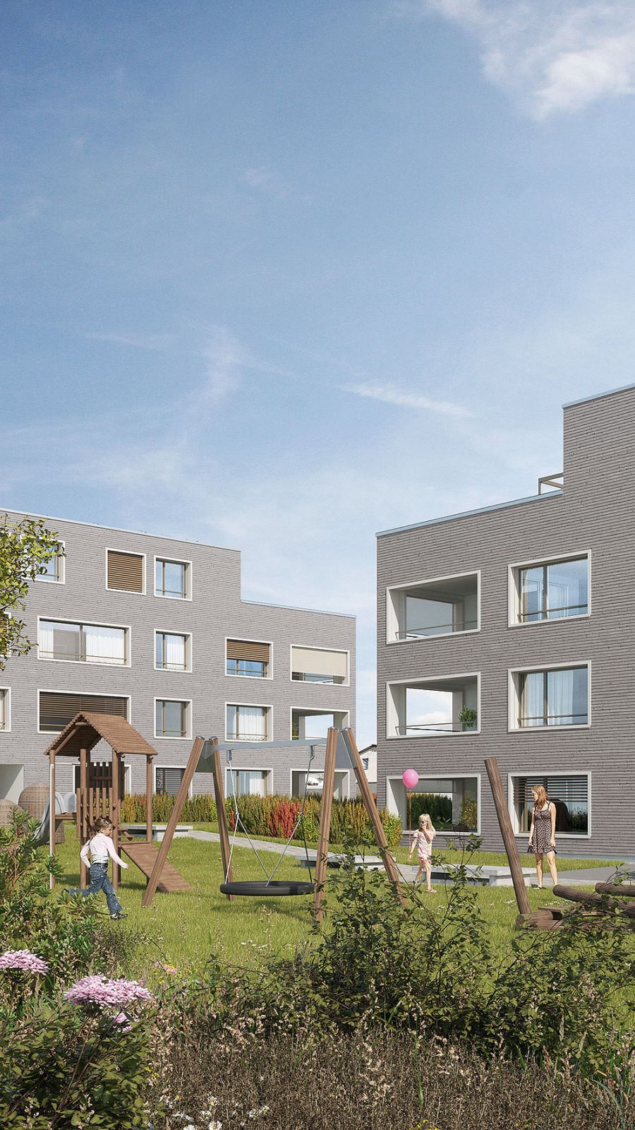 Das grafische Erscheinungsbild illustriert die nachhaltige Bauweise der PlusEnergie-Häuser in Holzrahmenbauweise auf einfache, verständliche Weise. Begleitet von einer Reihe an massgeschneiderten Kommunikationsmitteln zeigt es das künftige Ambiente eines lebendigen, familiären Quartiers.