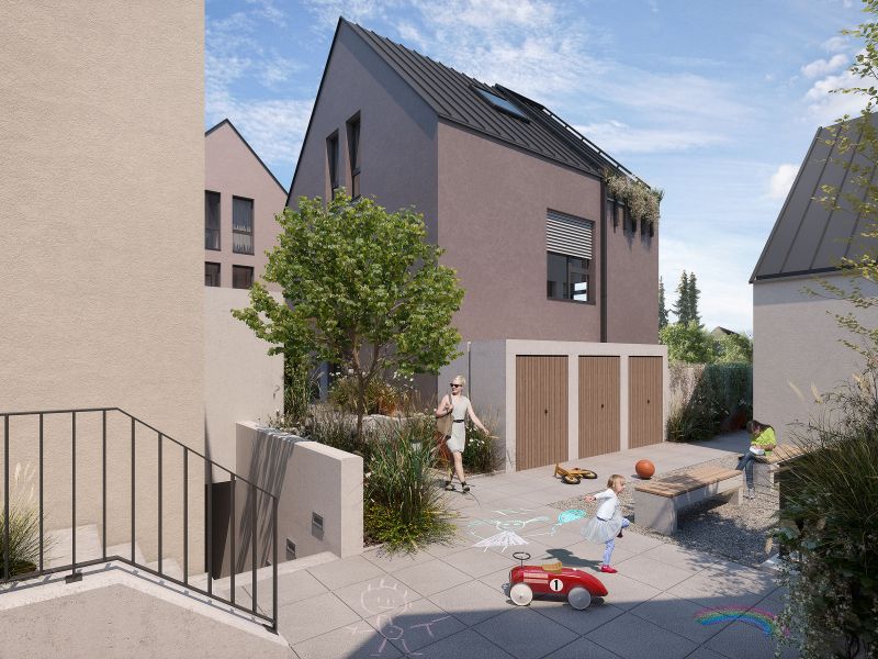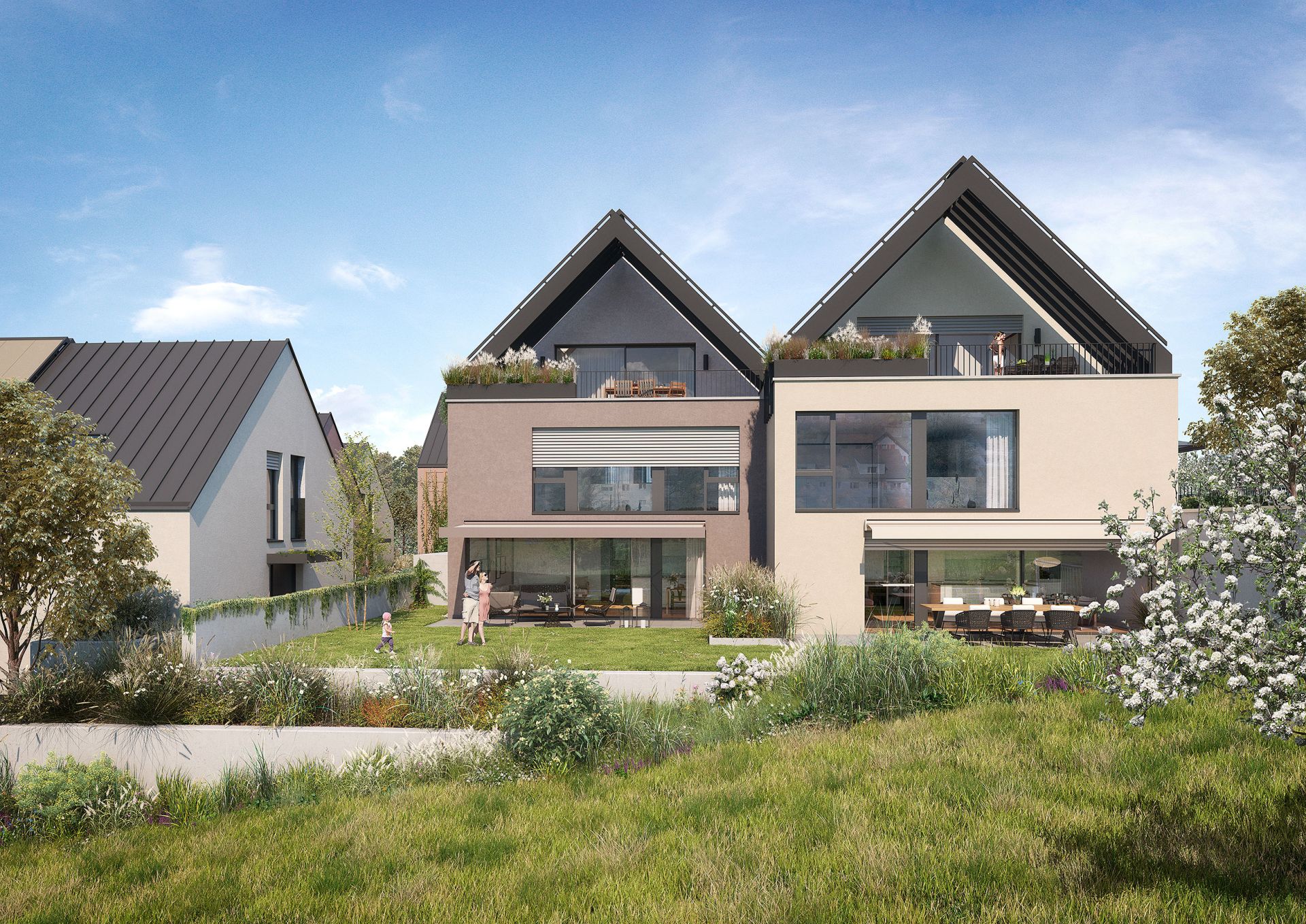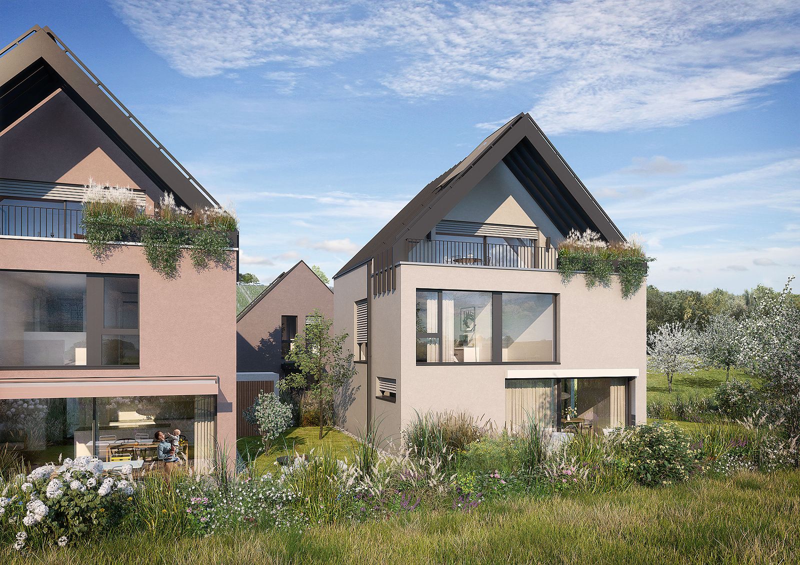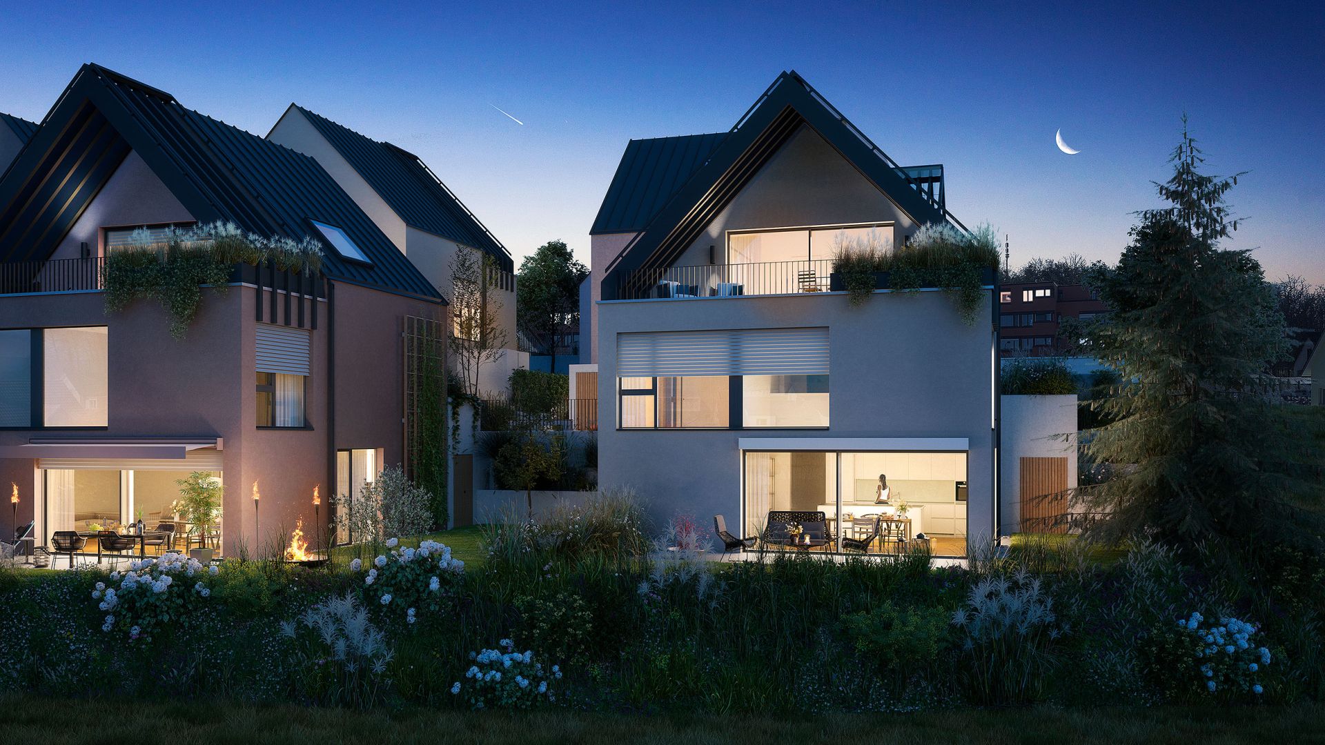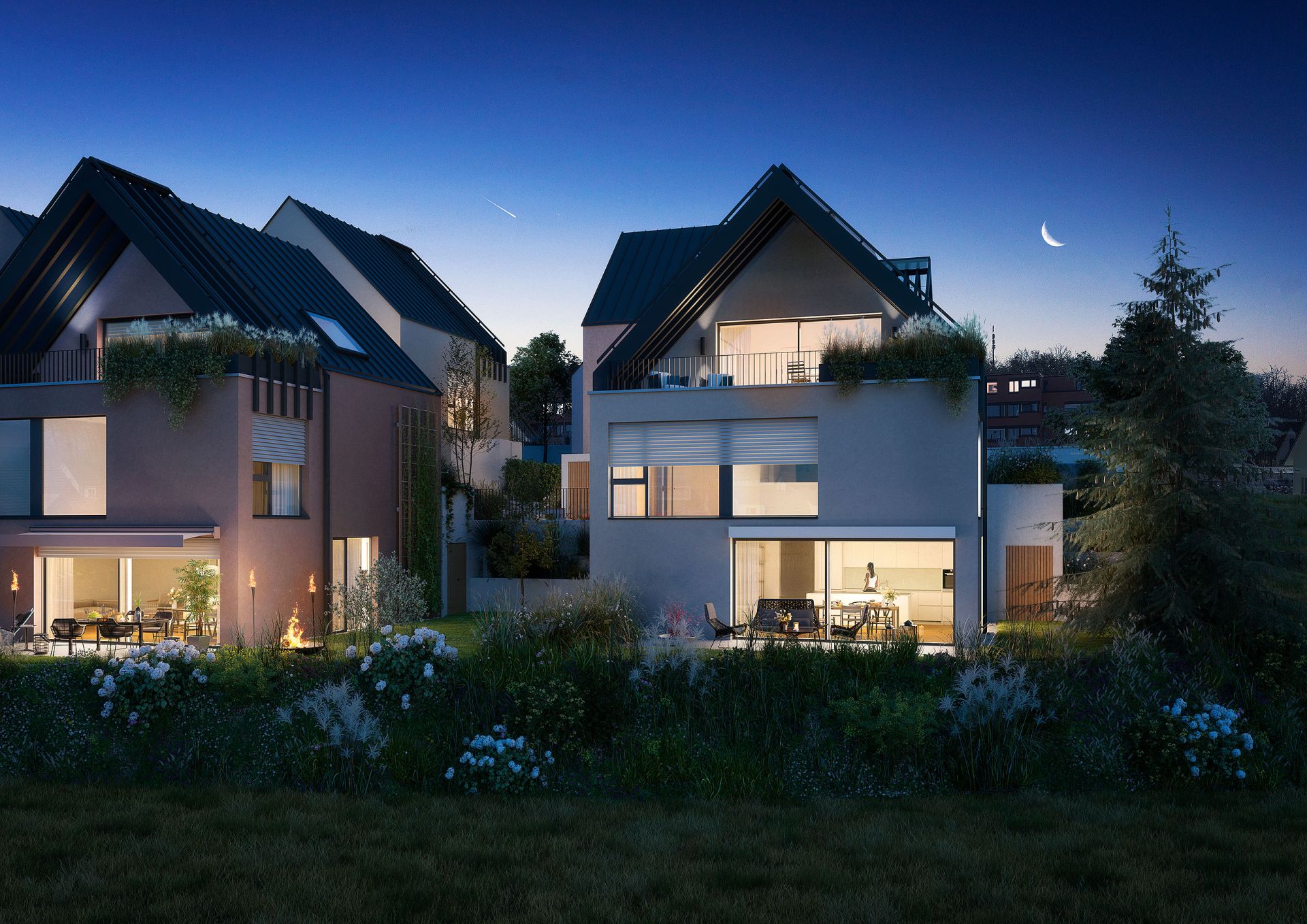 Umgeben sind die Gebäude von einem ebenerdigen Garten mit Sitzplatz, sowie einer Dachterrasse auf dem obersten Geschoss. Für Gartenutensilien und dergleichen verfügt jedes Haus über ein grosszügiges Aussenréduit. Die Energieerzeugung erfolgt mittels Erdsonden. Daneben kommt eine Photovoltaikanlage zum Einsatz, welche unter anderem auch die Ladestationen für die Elektromobilität speist.
