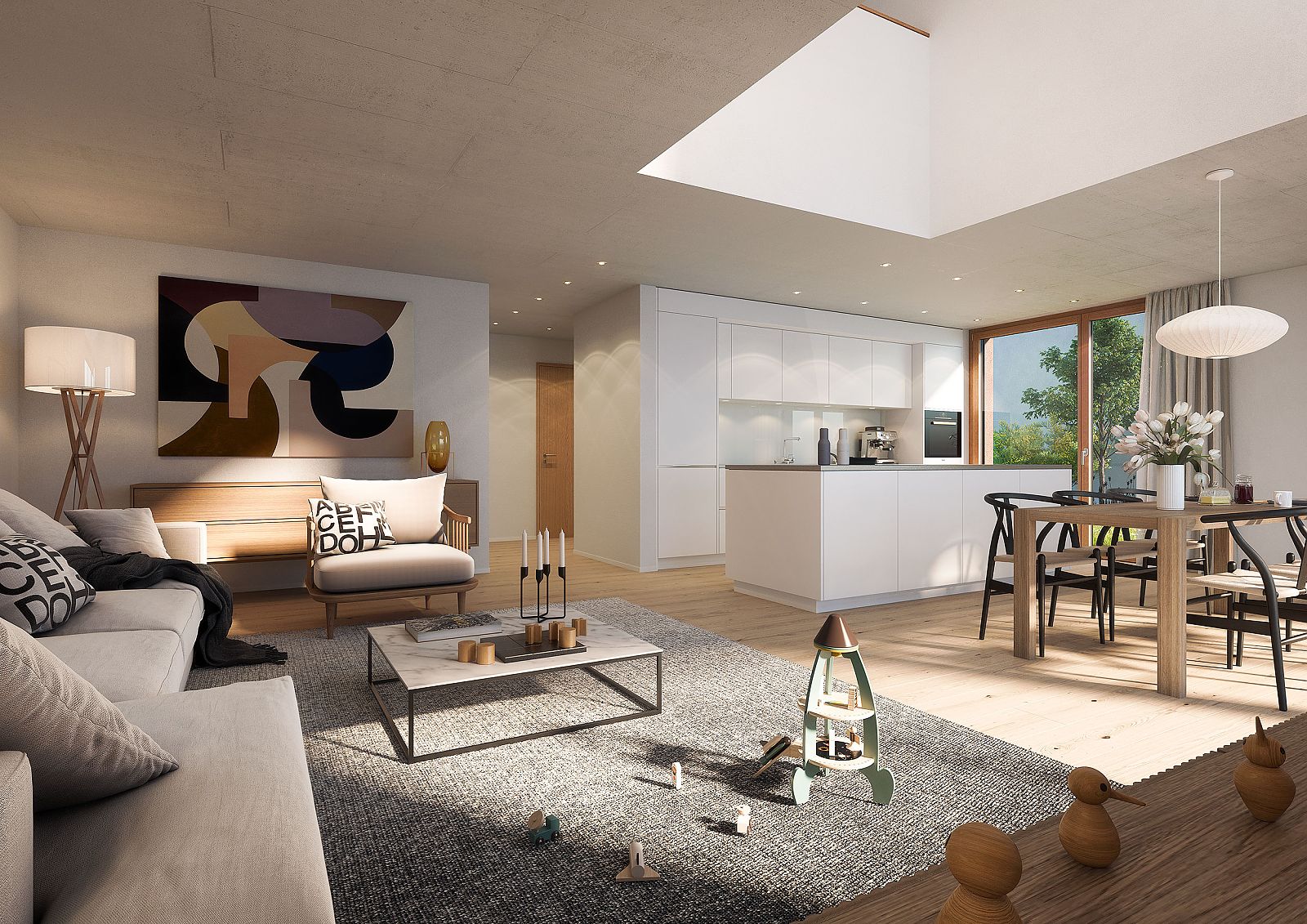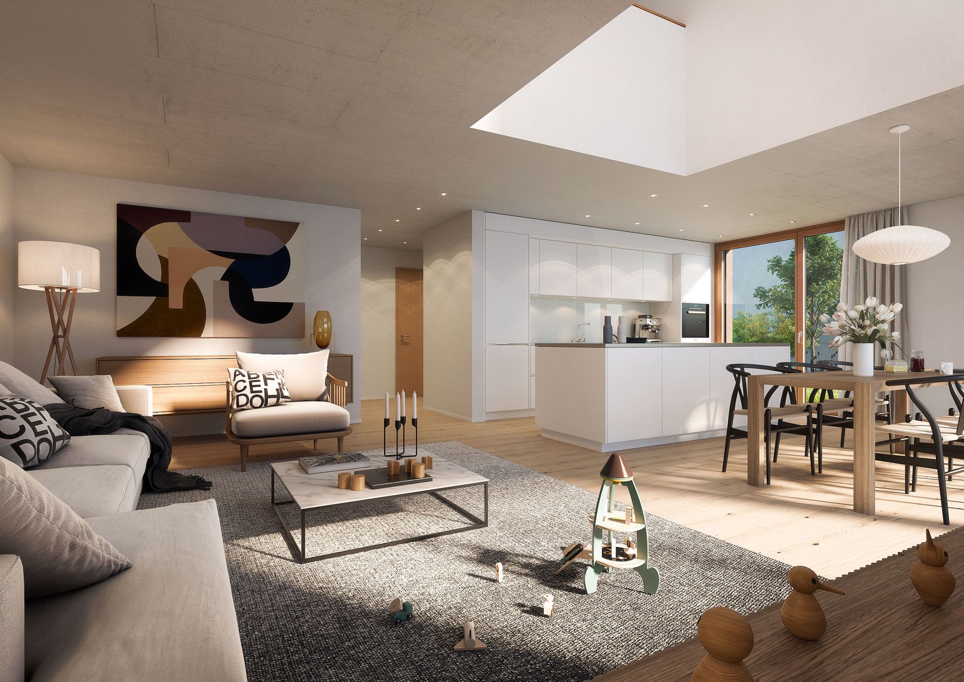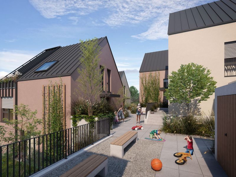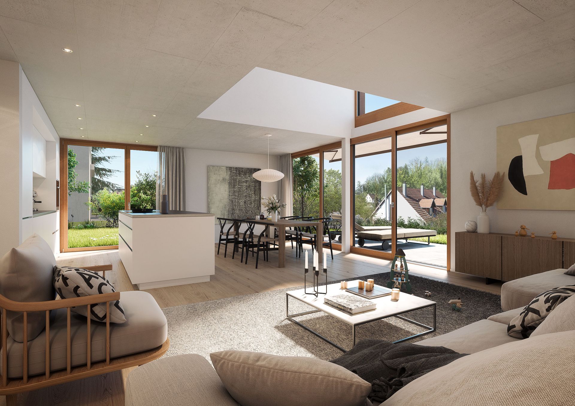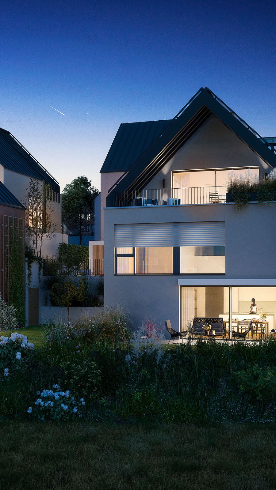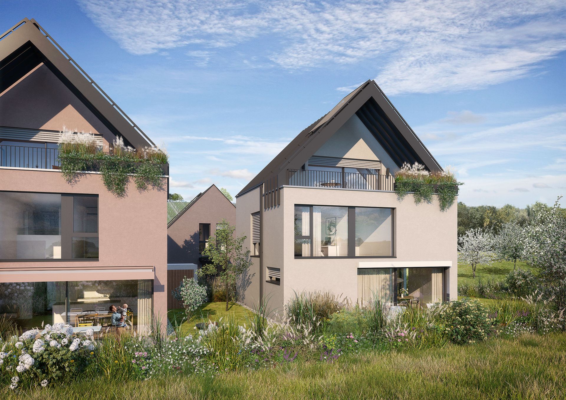Umgeben sind die Gebäude von einem ebenerdigen Garten mit Sitzplatz, sowie einer Dachterrasse auf dem obersten Geschoss. Für Gartenutensilien und dergleichen verfügt jedes Haus über ein grosszügiges Aussenréduit. Die Energieerzeugung erfolgt mittels Erdsonden. Daneben kommt eine Photovoltaikanlage zum Einsatz, welche unter anderem auch die Ladestationen für die Elektromobilität speist.