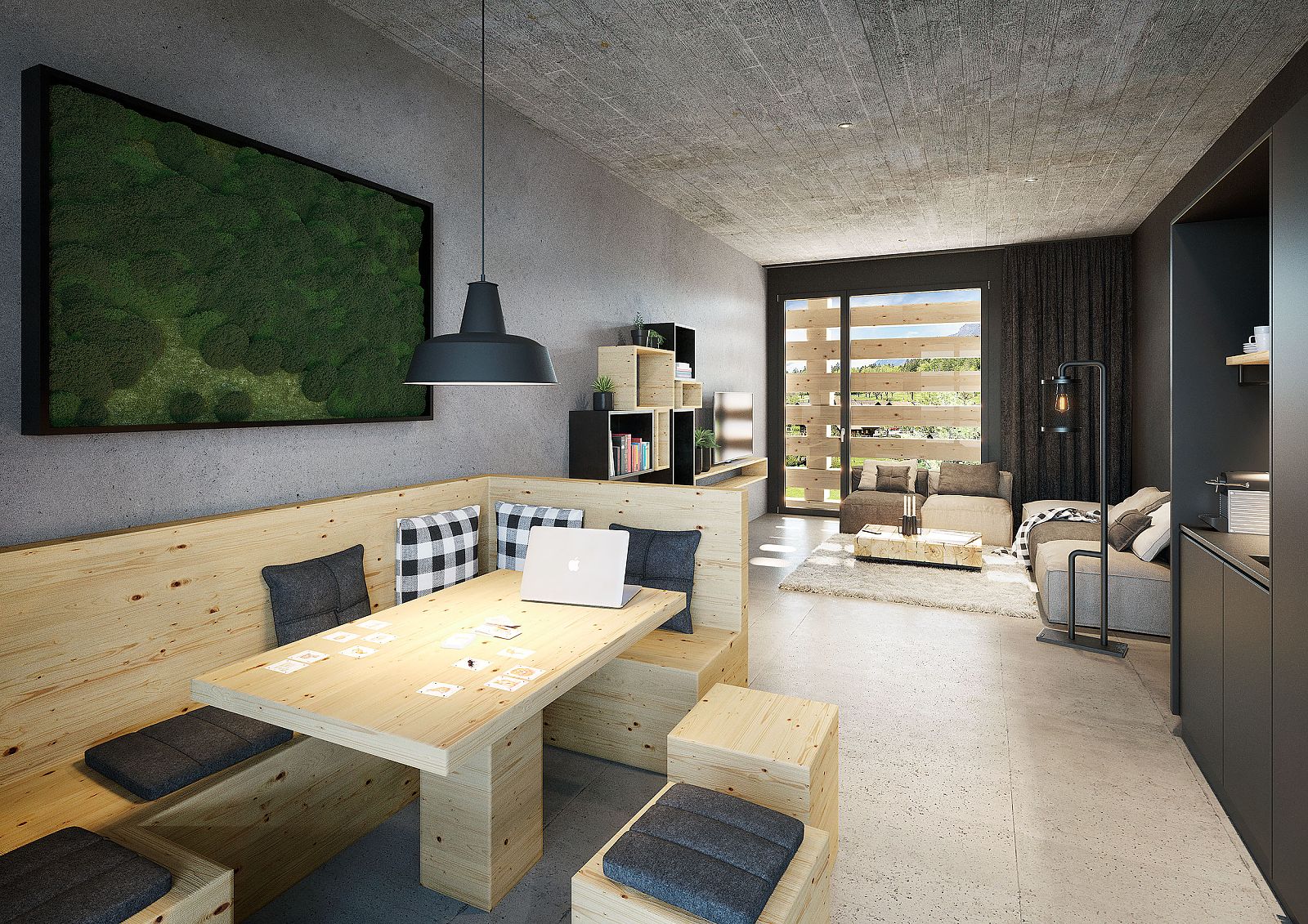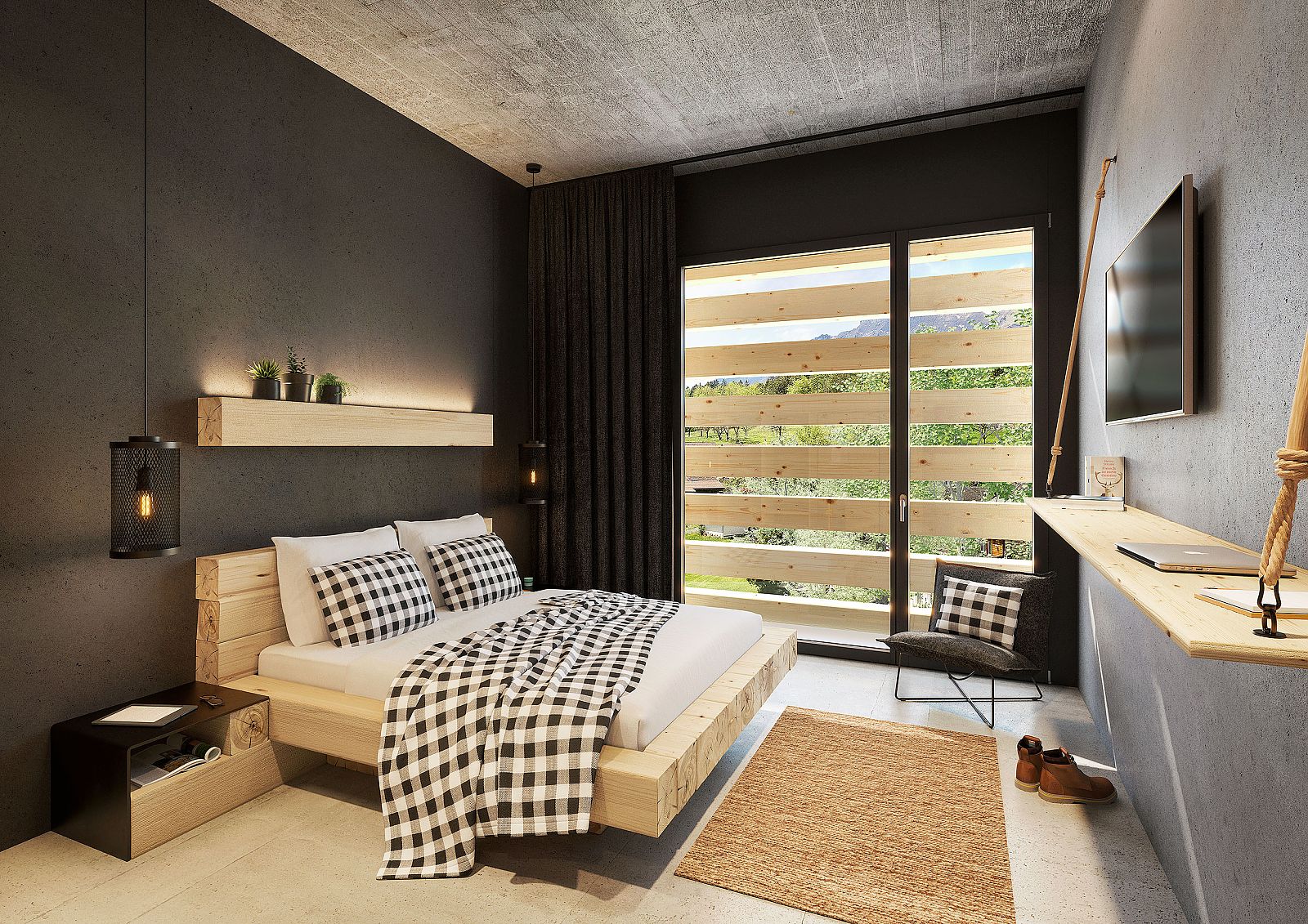 Dieses Kredo untermauert den Design-Entwurf unserer Innenarchitektin. Alles andere als bretterhart! Im lässig-stylischen Zimmer, umgeben von duftenden Holzbrettern und frischer Bergluft, heisst es - einkuscheln und herrlich träumen!